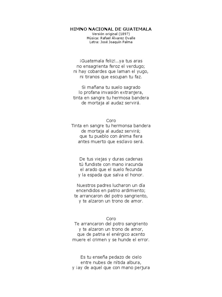 Que tus aras no profane jamás el verdugo; Nació en bayamo, cuba, el 11 de septiembre de 1844; Himno nacional de guatemala.la letra del himno nacional de guatemala es original del poeta cubano josé joaquín palma y la música fue compuesta por el. Guatemala tiene la suerte de contar entre sus símbolos patrios, con uno de los himnos más hermosos del mundo, considerado, así por el conservatorio de milán, clásica tierra de la música. 365 likes · 4 talking about this.